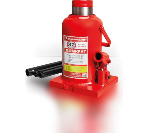 Домкрат бутылочный грузоподъемностью до 32 тонн используется при ремонте и техническом обслуживании транспортных средств, для поднятия тяжестей при строительстве или ремонтных работах.
