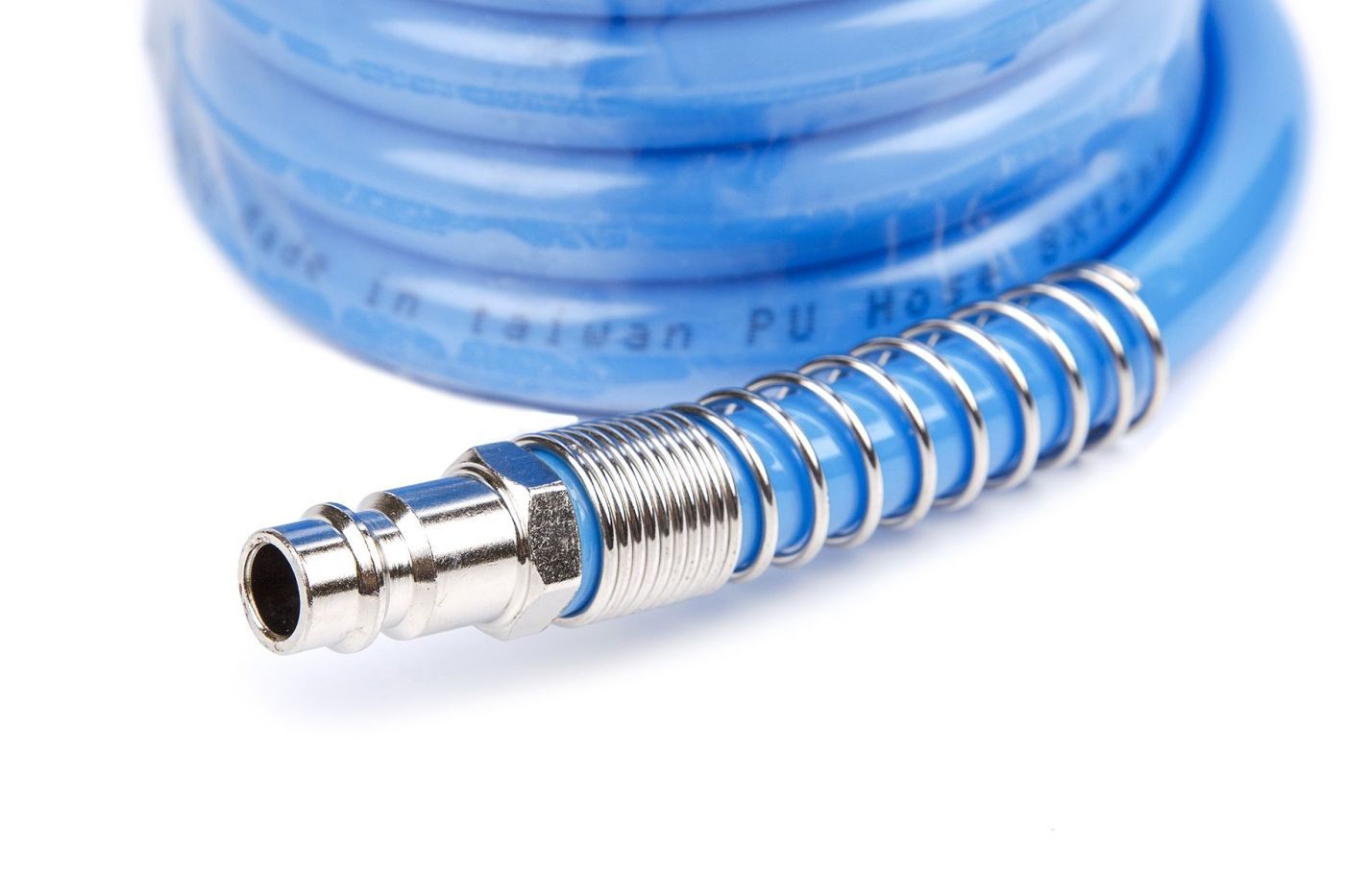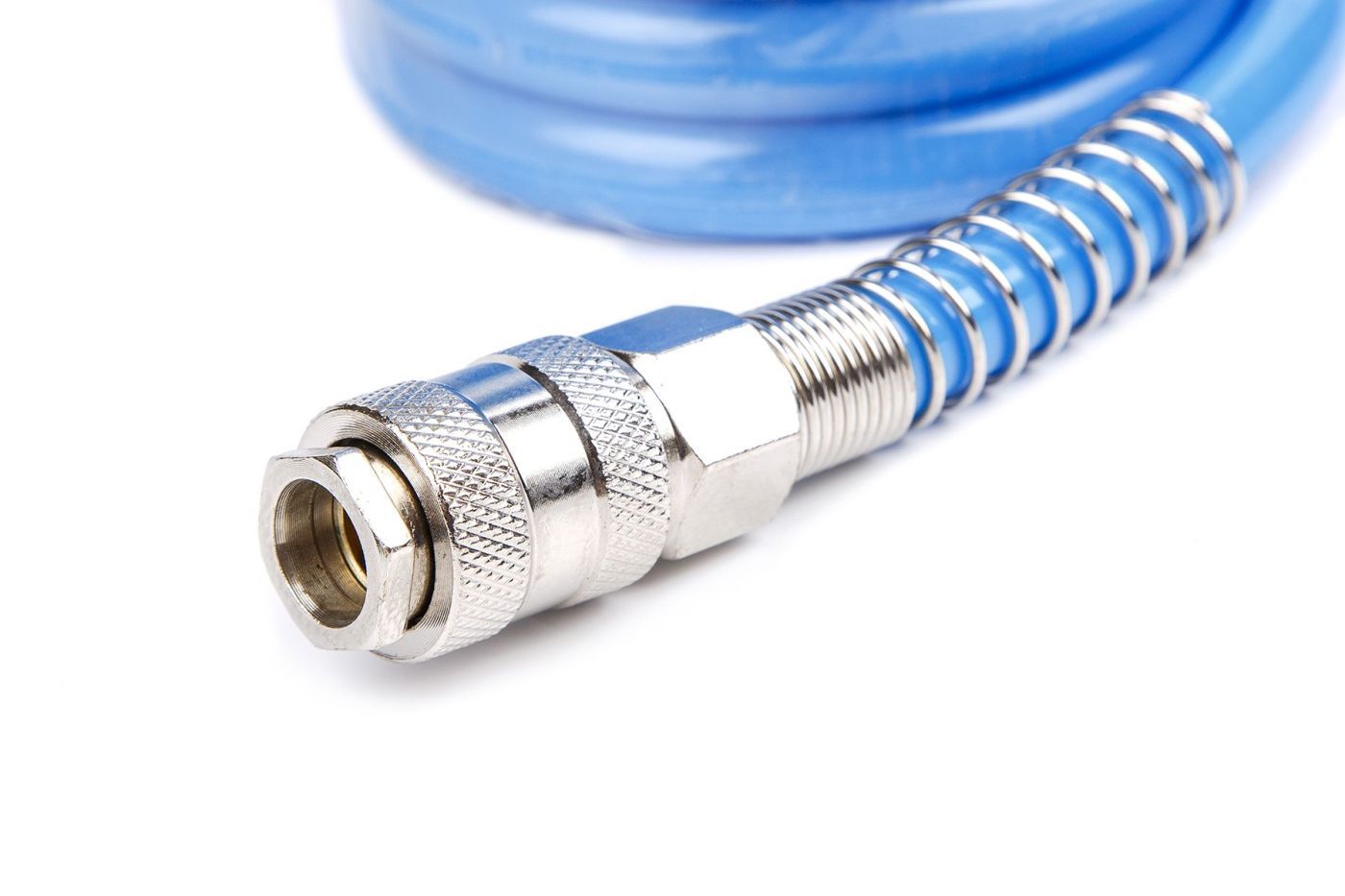 Полиуретановый спиральный шланг применяется для подачи воздуха от компрессора или линии сжатого воздуха к пневмоинструменту. За счет своей формы в виде спрали, шланг имеет достаточно компактный размер и не мешается под ногами. Как следствие - минимальный риск падения персонала. При этом, в растянутом виде шланг имеет длину 10 м, что позволяет комфортно работать с пневмоинструментом. С двух сторон шланг оснащен резьбовыми наконечниками для подключения быстросъемных соединений.