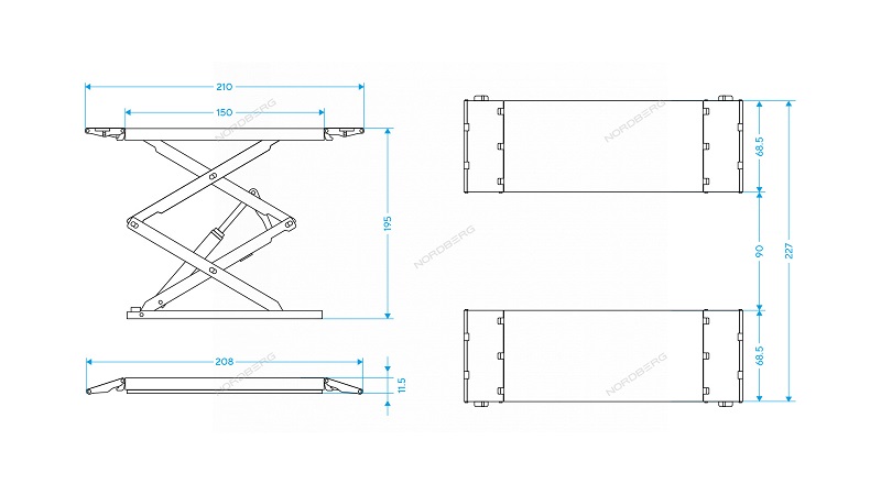 - Низкий профиль — в сложенном положении высота подъёмника всего 11.5 см, что удобно для заезда автомобилей с низким клиренсом;