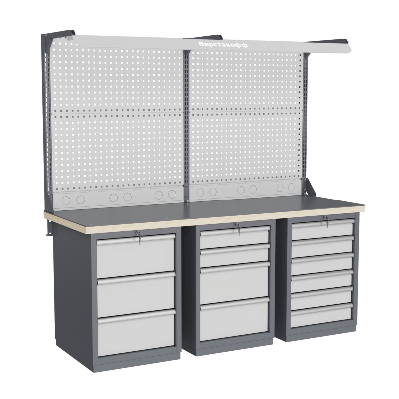 Верстак может комплектоваться одинарным или двойным перфорированным экраном, электромонтажным блоком для установки розеток и дополнительных устройств, а также комплектом освещения с держателем и лампой. Перфорация экрана подходит под стандартные держатели для инструментов, отверток, крючков, полок. Возможна комплектование верстака навесным элементами (держатели, крючки, полки).